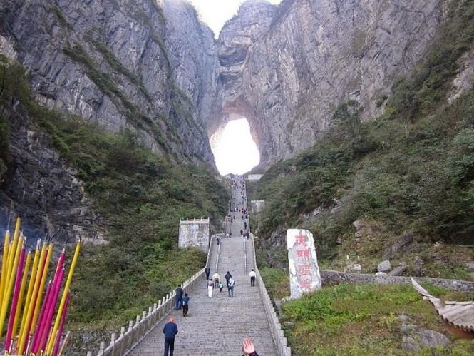 Всего в восьми километрах к югу от города Чжанцзяцзе (Китай) на северо-западе провинции Хунань, в Национальном Парке горы Тяньмэнь находится необычный объект природного происхождения - огромная естественная арка в карстовых породах горы Тяньмэнь или Тяньменьшань (Tianmen Shan), называемая - «Небесные ворота» или же пещера «Тяньмэнь» (Tianmen Cave). Это, пожалуй, самая красивая природная арка в мире. Примечательно, что хоть арка образовалась довольно давно, но достоверно известно, когда именно это произошло. Всё это благодаря внимательным китайцам, которые все события фиксируют в своих летописях. Как записано в отчете "Трех Королевств Китая" арка «Небесные ворота» или же пещера Тяньмэнь, сформировалась после землетрясения, которое произошло в 263 н. э, тогда огромный кусок скалы откололся и отвалился от горы называвшейся тогда Сунлянь, после этого события её и переименовали в Тяньмэнь. Образовавшаяся арка «Небесные ворота» была измерена и известно, что длина её составляет 60 метров,