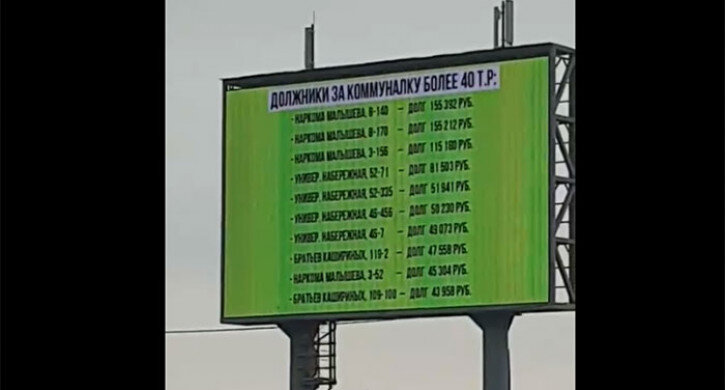 Управляющая компания (УК) «Домуправ» решила бороться с должниками очень странным способом, заказав видеоролик со списком должников «Академ Riverside» на рекламном экране. Теперь челябинцы любуются списком квартир, чьи владельцы задолжали за коммуналку большие суммы - среди них 10 квартир с долгом от 40 тыс. до 155 тыс. рублей.