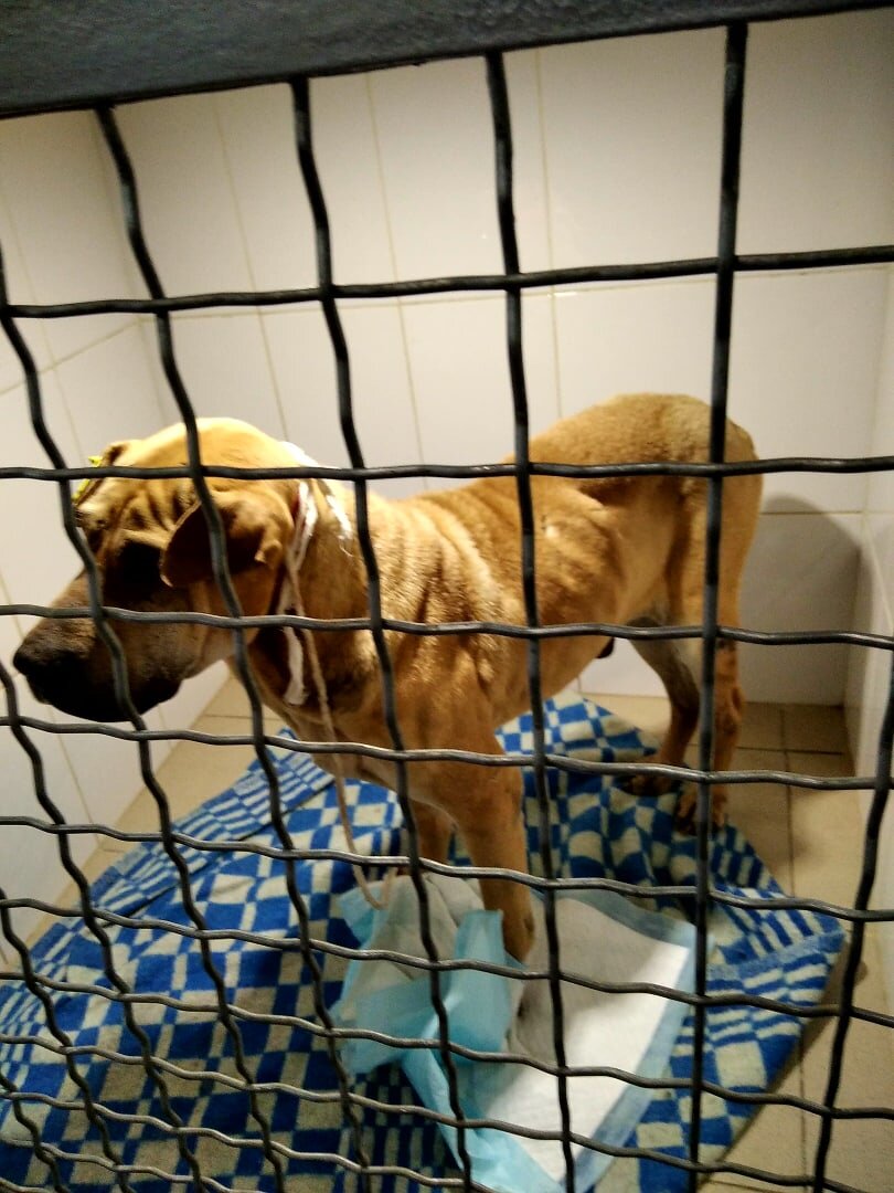 Сегодня Сэм был доставлен в ветклинику на Мира , где ему взяли анализ крови и сделали УЗИ. Заключение ветврача ИСТОЩЕНИЕ ... пес не ел , хотя аппетит у него отменный. Привезли волонтеры в клинику еду, кушает замечательно. Теперь мальчика надо откармливать, на это уйдет пару месяцев...