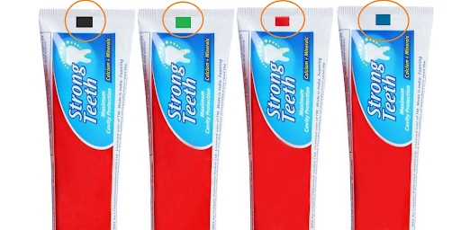 Немного о зубной пасте. На каждом тюбике зубной пасты, у основания есть полоска определённого цвета. Такие полоски бывают трёх цветов: Черная, синяя и зеленая. Тюбик с черной полосой, содержит в пасте образив. Хорошо отбеливает, ночасто пользоваться такой пастой нельзя. Так как образив поцарапает эиаль зубов. Такой пастой можно пользоваться не чаще одного раза в неделю. Тюбик с синий полосой — в пасте содержится образив но гораздо меньше. Такой пастой рекомендуют зубы чистить не чаще 2 — 3-х раз в неделю. И тюбик с зеленой полосой — это скорее фито паста, такой нужно чистить зубы каждый день утром и вечером. Если на хвосте тюбика присутствует черная полоска, — паста жутко ядовита и вообще «целиком из нефти»; синяя, красная — тоже ничего хорошего, ну а зеленая — чисто травы да натуральные вещества. О вредности. Черная — содержит вещества, усиливающие пародонтоз; Красная – содержит вещества, опасные для здоровья; Синяя – содержит допустимые синтетические вещества, не опасные для здор