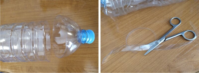 Отрезаем полоску от бутылки. Делаем один край поуже, другой пошире. С помощью степлера делаем отверстия в широкой части ленты.