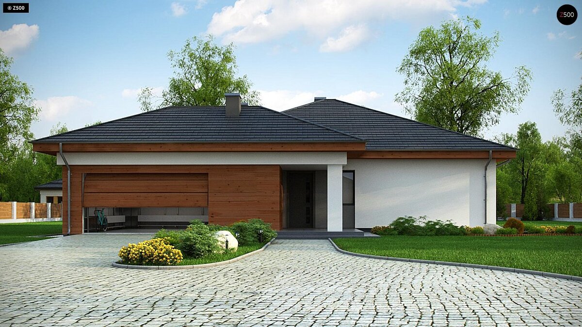 Z333 представляет собой проект комфортного одноэтажного дома с гаражом для двух авто и кровлей сложной конструкции. По достоинству оценят проект, как ценители современного архитектурного искусства, так и сторонники традиционных домов. Чем привлекателен проект Z333: Мы знаем, что много застройщиков мечтает о том, чтобы в доме царила атмосфера тепла, уюта и спокойствия. Наилучшим средством достижения этой цели являются камины для дома современные, которые присутствуют в большинстве проектов Z500. Понравился проект? Пишите комментарии. Посмотреть другие проекты вы можете на сайте.