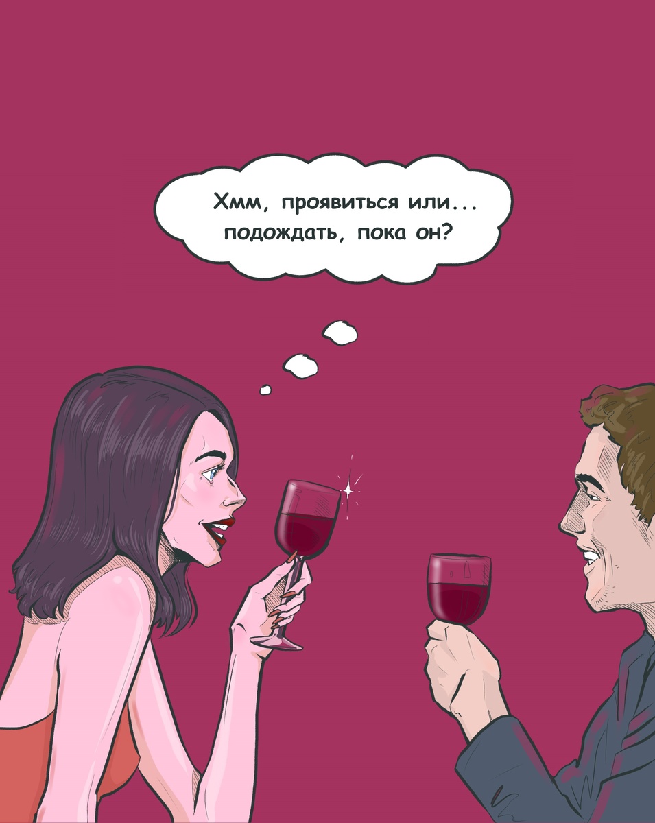 Например, ты уверена, что ты такая (такой) классная пришла на свидание, и ждёшь, когда тебя начнут впечатлять. А почему впечатлять должны тебя, а не наоборот? Тебя еще не знают, к тебе присматриваются, и ты тоже.