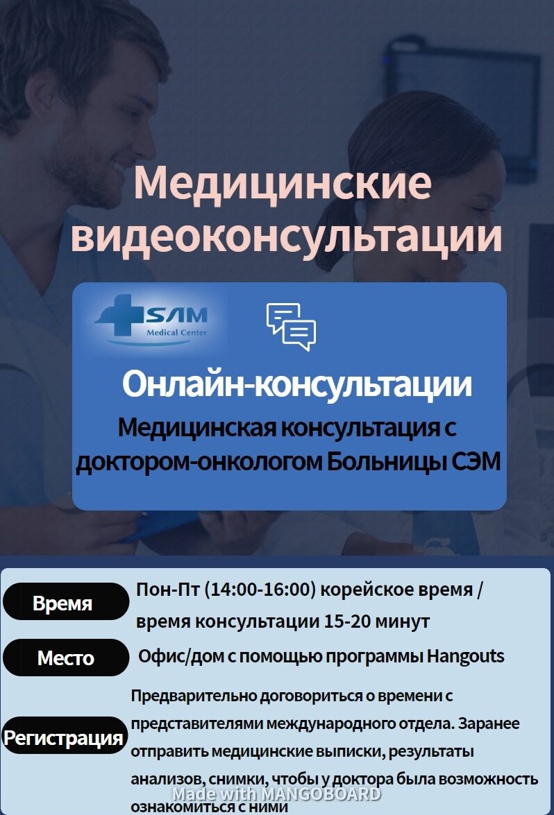 Международная Больница «СЭМ» — многопрофильный медицинский центр, в котором можно получить качественную диагностику и лечение всех видов заболеваний. В 2009 году на базе Больницы «СЭМ» в целях обеспечения высоко-качественного профессионального сервиса был создан Международный медицинский центр. В 2010 году больнице присвоено 1 место за привлечение иностранных пациентов. В 2011 и 2012 году в этой же номинации больница заняла 2 место. Коллектив международного центра – это медицинские координаторы-переводчики, которые свободно владеют английским, монгольским, русским и китайским языками, обеспечивая тем самым общение между персоналом больницы и пациентом. Для получения видеоконсультации специалиста требуется отправить имеющиеся медицинские документы и снимки, после чего мы сориентируем по возможной дате и времени проведения консультации. Медицинская консультация с доктором-онкологом Больницы «СЭМ» проводится с понедельника по пятницу (14:00 — 16:00 корейское время) из дома/офиса с помощ