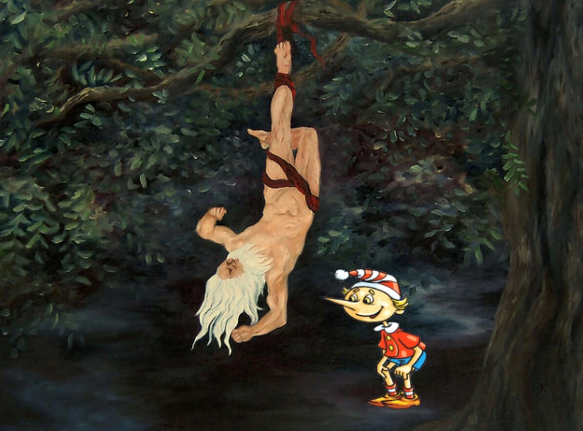 В лесу Буратино, как и заповедано, первым делом спросил у тополя. Спросил вежливо: "Сестру мою не видал? Не пробегала тут?" Но тополь просто забросал его осеннею листвой, не сказав ни слова. То ли не знал ответа, то ли просто был хамоват по природе. Буратино разозлился. Пнул тополь и пошел к ясеню. Ясень был большой. Поэтому, когда он тоже не ответил на вопрос, пинать его Буратино поостерегся. "Не расслышал, может", – подумал Буратино и аккуратно подергал его за нижние ветви: – Эй! Сестру, говорю, не видал мою? Вместо ответа из кроны с шумом вывалился на веревке крепкий мужик свирепого вида и повис, качая головой. – Понятно, – вздохнул Буратино. – И ты, значит, тоже не видел? Мужик молчал, сверкая на Буратино единственным глазом. – Давно здесь отдыхаешь? – спросил Буратино. Мужик продолжал молчать. Буратино кивнул: – Опять понятно: говорить не можешь - золотые во рту. Это дело нам целиком знакомое, самим случалось. Погоди, сейчас я тебя срежу... – и полез на ясень. Мужик пр