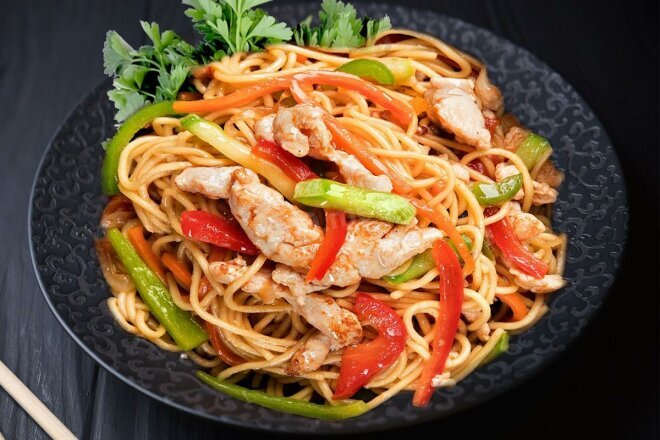 Рецепт на 4 порции Ингредиенты: Приготовление: Лапшу удон варить в кипящей воде около 7 минут ( время зависит от марки), затем промыть в холодной воде. Куриное филе нарезать ломтиками и обжарить на сковороде. Затем добавить нарезанные соломкой овощи и 3 столовые ложки соевого соуса, обжаривать около 5 минут. К мясу и овощам добавляем сваренную лапшу, добавляем соевый соус 4 столовые ложки. Обжариваем 3 минуты. Вместо курицы можно использовать любое мясо или морепродукты, по желанию можно добавить зелень и любимые овощи. В дополнение я использую соус Терияки. Лапша готова! Приятного аппетита 😊