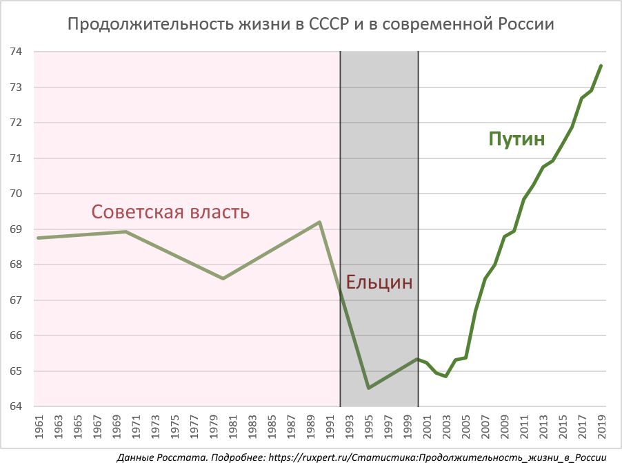 1. Преимущества мудрого правления Владимира Путина перед ковбоями 1990-х и советскими фантазёрами позднего СССР с каждым годом становятся всё очевиднее. Я обновил диаграмму продолжительности жизни в России для статьи на «Справочнике патриота»: