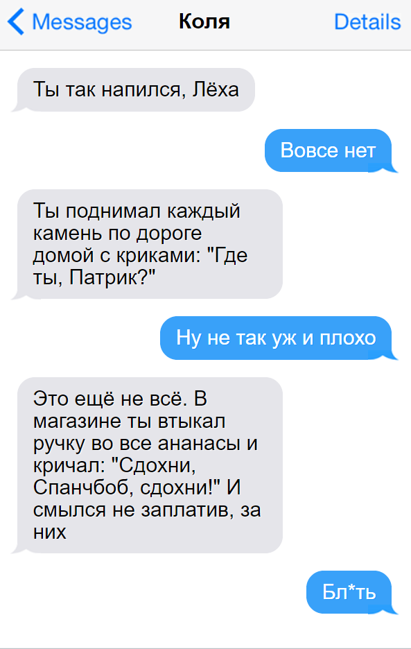 Как перестать писать писать смс-ки, подбухнув? Наверно единственный способ - чтобы как только неуклюжие пьяные пальцы тыкались в экран телефона, он человечьим голосом вещал «Воу-воу, бро, ты пьян. Стопэ!" Хотя вряд ли бы лично меня это остановило, скорее только подзадорило) И понеслось...Сразу вспоминаются бывшая или та девушка в офисе, с которой вы слегка флиртовали и обменивались смешными текстами. Вытягиваем язык, открыв один глаз, другой прищуриваем для концентрации, и неуклюже тыкаем указательным пальцем в экран. И уже наутро можно удивиться той поэзии или философской глубине пьяного текста, на который вы оказались способны, когда ограничения базовой социальной порядочности исчезли. Я подобрала для тебя топ с самыми забавными смс-ками от пьяных друзей и подруг. Иногда можно узнать многое о своем знакомом, провожая его домой после вечеринки. Например, что ваш суровый друг, начальник цеха на металлостроительном заводе, на самом деле обожает мультики... Некоторые мои знакомые не пи