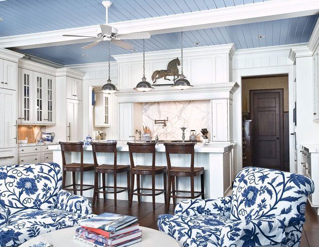 Несмотря на холодное сочетание цветов, использование сине-белой гаммы в интерьере не создает нордической холодности, а скорее наполняет оформление фарфоровой хрупкостью и прозрачностью.