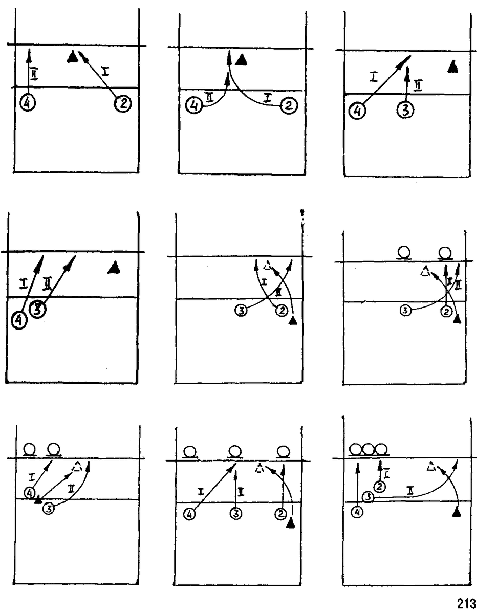 1. Игрок зоны 1 выходит к сетке на стык зон 2 и 3 и всеми своими действиями показывает, что мяч будет направлен быстро выбежавшему к сетке волейболисту зоны 3, но в последний момент выполняет кистевую передачу за голову на игрока зоны 2. 2. То же, что и в случае 1, но мяч для удара адресуется игроку зоны 4. 3. «Крест». Первый вариант. Игрок зоны 1 выходит к сетке. Его партнер, находящийся в зоне 3, разбегается и имитирует удар с короткой передачи. Нападающий зоны 2 перемещается в зону 3 и завершает комбинацию. Для успешной организации атаки прием подачи обеспечивают игроки зон 5 и 6. Второй вариант. Игрок зоны 3 выходит за спину разводящему и имитирует атаку, а волейболист зоны 2 перемещается в зону 3 и производит удар. 4. То же, что и в ситуации 3, но игроки зон 3 и 2 имитируют комбинацию «Крест», а мяч для удара адресуется волейболисту зоны 4. 5. «Обратный крест». Игрок зоны 1 выходит ближе к зоне 3. Его партнер из зоны 4 разбегается и имитирует удар с короткой передачи в зоне 3. Н