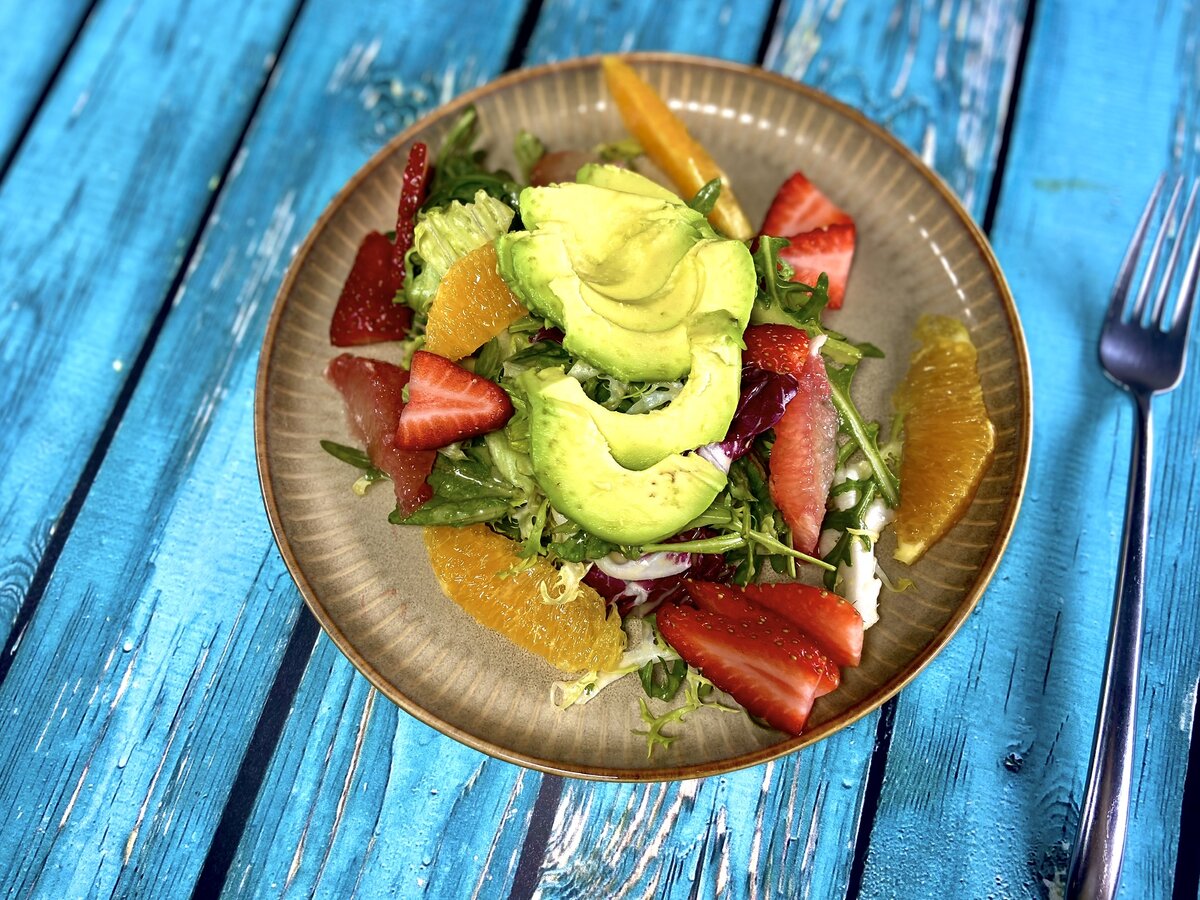 Летний салат с медово - цитрусовой заправкой Заправка 1 Оливковое масло - 3 ст.л. 2 Мёд - 3 ч.л. 3 Дижонская горчица - 1 ч.л. 4 Бальзамический крем-соус - 1 ч.л. 5 Лимонный сок - из одного лимона 6 Молотый перец Салат 🥬 Листья салата ( любые на ваш вкус) Апельсин Грейпфрут Клубника Авокадо 🥑 Количество ингредиентов зависит от ваших вкусовых предпочтений. Рецепт пошаговый 👇🏻 Начнём с заправки , удобней всего смешать в обычной банке (250-300 мл) . Смешаем в банке оливковое масло, горчицу, перец , лимонный сок, бальзамический соус, мёд и все хорошенечко взболтаем. Добавим готовую заправку к листьям салата. Выложим на тарелку. Порежем апельсин, грейпфрут, клубнику и авокадо дольками. Выложим вокруг листьев