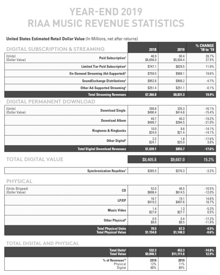 В конце февраля вышел итоговый отчёт (дoступен pdf) RIAA (Recording Industry Association of America – Америкaнская ассоциaция звукозаписывающих компаний) о местной музиндустрии в 2019-м, которая является самой крупной в мире, и можно на её примере представить, что происходит и в других развитых странах.
