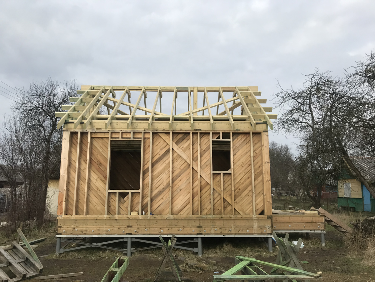 Простые и надежные укосины крыши У строителей каркасных домов довольно часто возникает вопрос о том, как обеспечить жесткость стропильной системы путем установки укосин. Ниже предлагается апробированный мною вариант установки укосин на стропильную систему холодного чердака моего дачного домика-крепыша. На первом фото показана вся конструкция в целом. Ширина домика по внешнему размеру каркаса составляет 4,8 м. При такой ширине поставить внутреннюю опорную стену, на которую можно было бы опереть стойки коньковой доски, невозможно. Комнаты с шириной немногим более двух метров никому не нужны. Поэтому для устройства крыши была использована технология висячих стропил, которая не требует опорных стоек. Для того, чтобы стропила не разъезжались, внизу они соединены затяжками из доски 50х150 мм. Каждая затяжка в совокупности с парой стропил образует букву «А» или попросту треугольник. Вначале необходимо установить по одной доске в нижние углы этого треугольника. Для этого достаточно поло