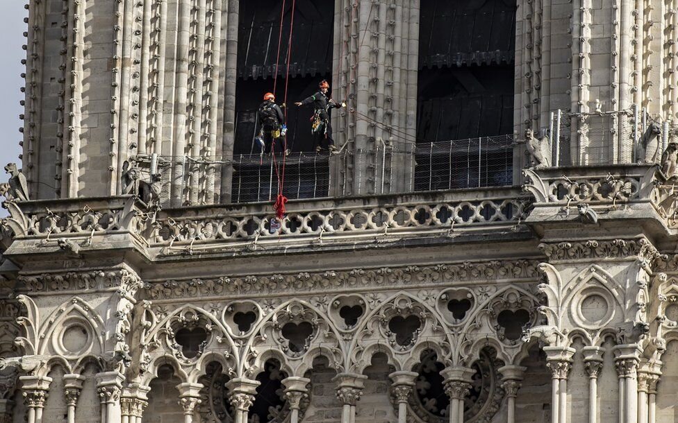 Рабочие были сфотографированы на фоне собора Нотр-Дам в Париже, спустя почти 11 месяцев после того, как пожар уничтожил 850-летнюю достопримечательность французской столицы. В понедельник реставраторы были замечены на сложных строительных лесах, окружающих крышу, в то время как некоторые из них сбросили фасад собора. Тысячи людей собрались на улицах вокруг собора, молча наблюдая за пламенем. Некоторые из них открыто плакали, в то время как другие пели гимны или читали молитвы. Главное сооружение, включая две колокольни, было спасено Президент страны Эммануэль Макрон назвал это "ужасной трагедией". Посетив место происшествия, президент отметил, что собор является зданием "для всех французов", в том числе тех, кто никогда там не был. Президент поставил пятилетнюю задачу по его реконструкции. В октябре 2019 года Министерство культуры Франции заявило, что для этой работы было привлечено или заложено почти €1 млрд (£850 млн; $1, В декабре прошлого года собор не провел рождественскую мес