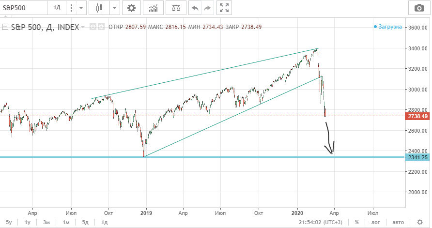 Еще вчера Америку пытались откупить, нефть пошла на закрытие гэпа и была надежда на небольшой рост рынков. Но надежда разбилась о суровую реальность. Нефть в моменте, преодолев сопротивление, ушла в район 40$ за бочку. Но уже сейчас всё говорит за продолжение снижения. Если вчера я еще хотел что-то купить на рынке, то сейчас только кэш. В портфеле остались акции Сбера. Сургутнфгз принес 8,3% на вложенный капитал или 4150 рублей. S&P500 снижается на 5%. Цель по движению - основание клина, 2340 пунктов. Нефть идет в район минимумов, 31$ за бочку. Продал Сургутнгзф ап. Дальше движение не пошло, объем вышел. Сбер держу, уже никуда не дергаюсь. Если выйдут позитивные новости от нефтедобычиков, то рынки могут так же гэпом открыться вверх. Буду усредняться на развороте. Посчитал, что движение вниз на 45 рублей по Сберу съест всю прибыль. Но при этом от текущих цен это уже будет 150 рублей за акцию. Плюс рублей 15 на дивах за вычетом налогов. Итого в безубыток могу сидеть в Сбере до 135 рубл