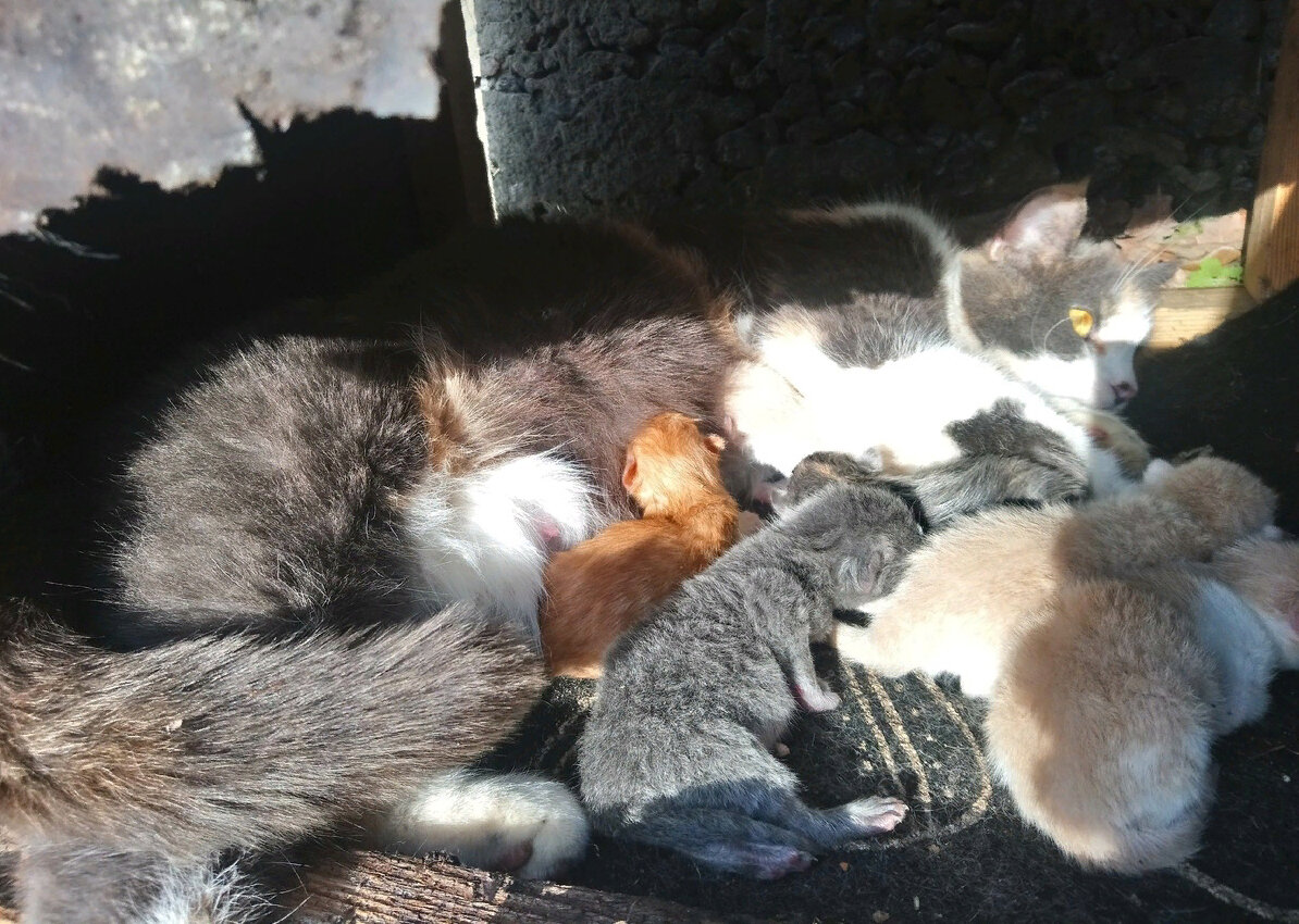 Лишь у одной доброй девушки дрогнуло сердце при виде этой картины. Она сразу поняла, что оставлять кошачье семейство возле помойки ни в коем случае нельзя. Девушка отнесла кошечку в тихое место и соорудила ей временное убежище. Она сфотографировала маму с малышами и разместила крик о помощи в группах зоопомощи нашего города.