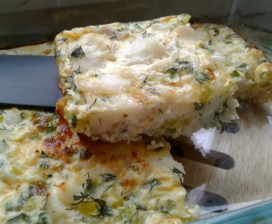 молоко (1,5% жирности) - 50 мл. Рыбу режем на порционные кусочки, выкладываем в сковородку, наливаем немного воды и чуть-чуть "припускаем" ее, не более 2 минут. Кабачок очищаем от кожуры (если плотная) и режем мелким кубиком. Солим и также "припускаем" на сковородке, но уже без добавления воды. Зелень мелко режем. Яйца взбиваем и смешиваем с молоком, солим, перчим. Рыбу выкладываем в форму для запекания, предварительно застелив ее пергаментом. Сверху выкладываем кабачок, посып