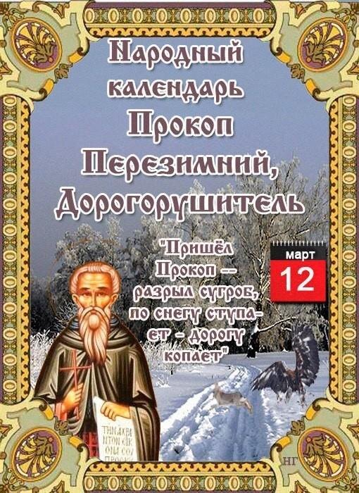 По церковному календарю этот день называют Прокоп Перезимний, Дорогорушитель. Сегодня православные люди почитают память преподобного Прокопия Декаполита, который посвятил свою жизнь борьбе с иконоборческой ересью. Люди, восставшие против культа икон, жестоко избили Прокопия и бросили в темницу, где он находился до смерти святого Василия, который был вместе с ним. Умер Прокопий уже в очень преклонном возрасте. Согласно народным поверьям, 12 марта судили о том, когда начинать сеять семена. Само имя святого, Прокопий, говорит за себя. Его связывают с «прокопанными» дорогами, изборожденными весенними ручьями и превращающимися в бездорожье. Именно с этого дня, по поверьям, наступает настоящая весна. Также, согласно народным приметам, сегодня нужно прислушиваться к своим внутренним ощущениям, собираясь в дорогу. Если на душе легко и спокойно – путь будет приятным, если же ощущаете беспокойство – может произойти неприятность. Чтобы не навлекать на себя беду в дороге нельзя свистеть, петь, г