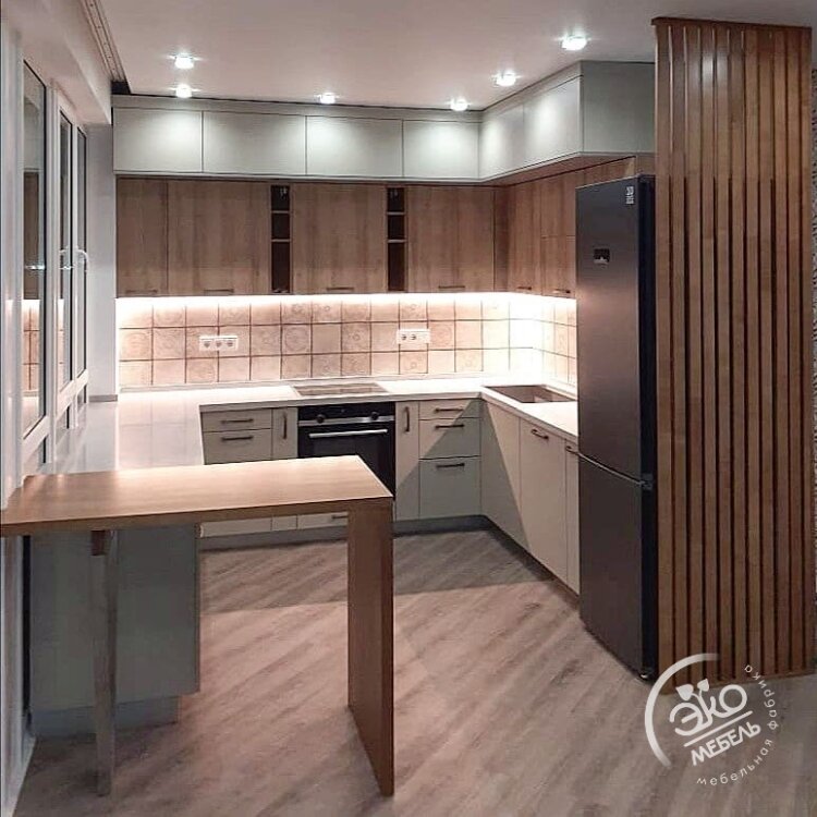 А красивым и удобным завершением проекта стал полуостров из массива дерева. Он значительно увеличил рабочую поверхность кухни. На фото, реализованный кухни "Лера" от "Экомебель". Компактная и удобная планировка. Нейтральные, светлые тона зрительно расширяют пространство небольшого помещения. -️ тон нижних шкафов и антресолей Серый туман.