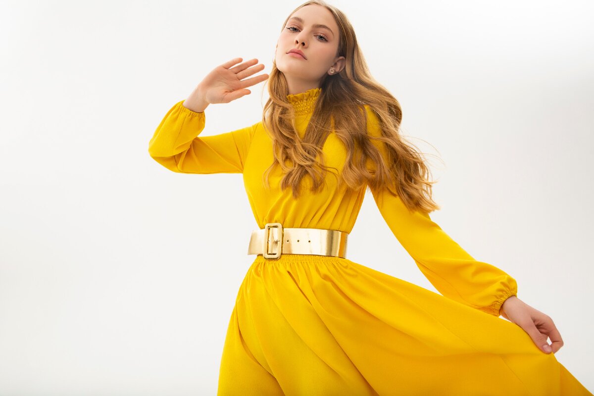 Для контрастного образа выбирай цвета, создающие мощную разницу с желтым не только в оттенке, но и в тоне (светлее или темнее). Для того, чтобы подчеркнуть цвет без лишнего контраста бери нюансные оттенки, как у нас на фото. Золотой пояс не перетягивает внимание, а только раскрывает желту