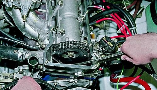 После этого нужно снять вал коромысла и зафиксировать положение цепи и звездочки относительно друг друга.