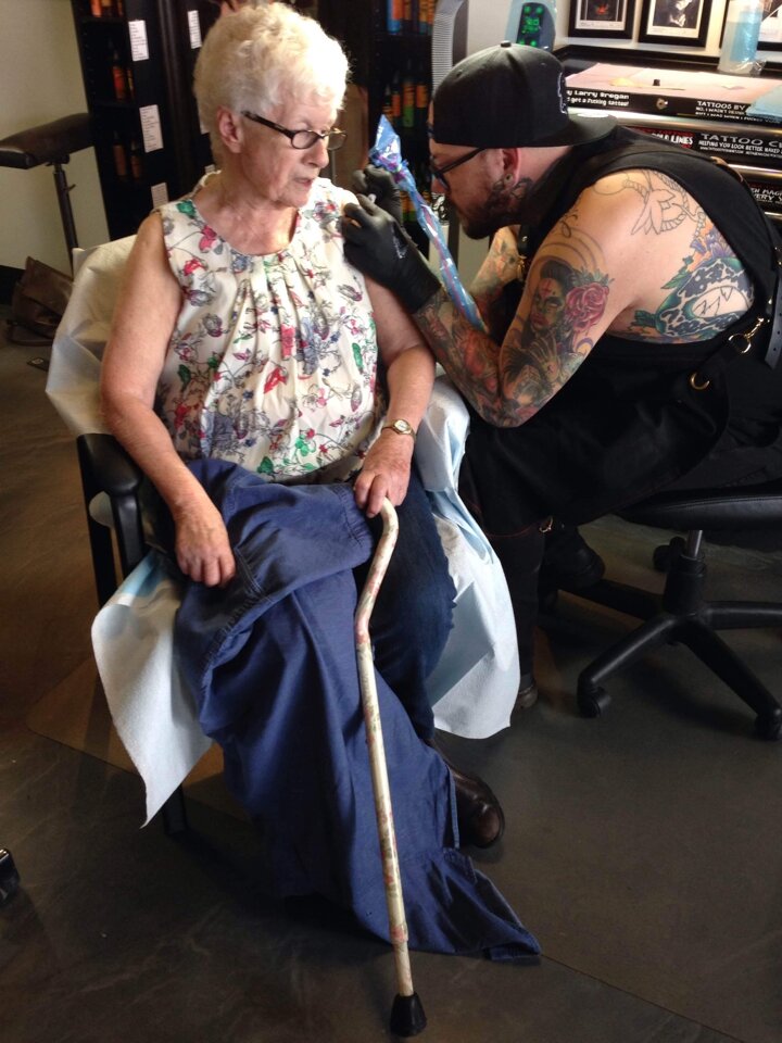 В свой 81-й год жизни некая Кристина Нагель (Christine Nagel) предприняла первый свой поход в тату-студию за тем, чтобы получить первую в своей жизни татуировку. Но это был не закидон престарелой леди. Её поступок объясняется конфликтом между её христианскими взглядами и политическими обстоятельствами. Дело в том, что Кристина достаточно набожный человек, исповедующий идеалы религии Христа. В соответствии с её религией никто, кроме господа бога не имеет права ни даровать жизнь, ни её отнимать. А местные депутаты города Калгари (Канада) недавно узаконили эвтаназию (умерщвление тяжело больных или старых людей для облегчения их страданий). Узнав эту новость пожилая леди была шокирована и решила при помощи татуировки защитить себя от подобного со стороны семьи, врачей или иных доброжелателей. Don’t euthanize me – теперь гласит надпись на её плече, коротко и ясно – Не умерщвляйте меня.