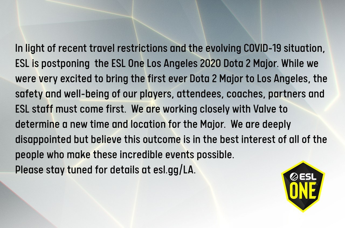 - ESL работает совместно с Valve о переносе дат и локации турнира.
