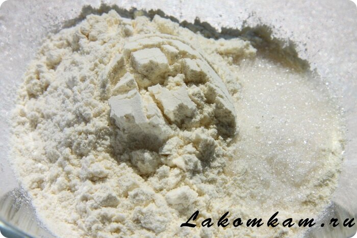 Ингредиенты: пшеничная мука — 200 грамм; сливочное масло — 150 грамм; разрыхлитель для теста — 1,5 чайные ложки; холодная вода — 2/3 стакана; сахар — 1 столовая ложка.