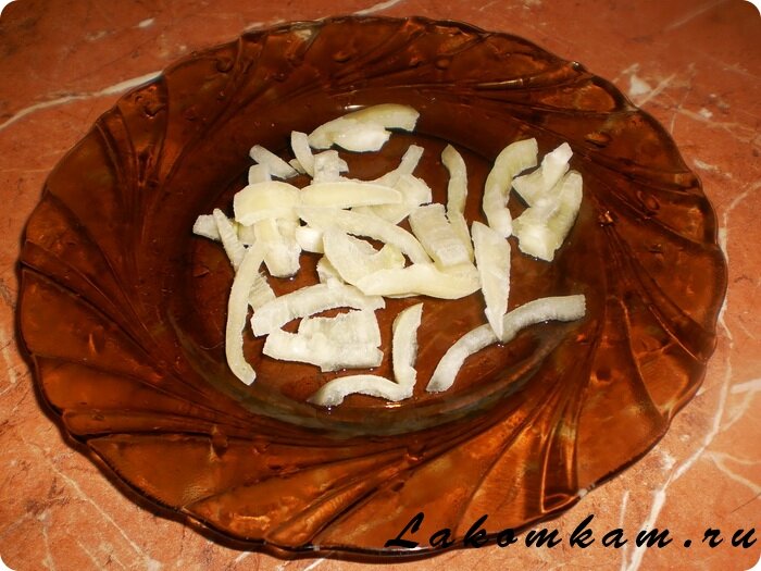 Приготовление сосисок по-корейски. Режем соломкой: болгарский перец,