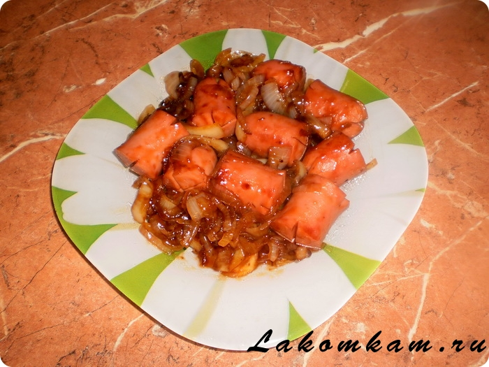 Ингредиенты: соевый соус — 2,5 столовые ложки; сосиска — 300 грамм; лук репчатый (средний) — 2 штуки; перец болгарский — 1 штука; кетчуп — 1,5 столовые ложки; сахар — 0,5 столовой ложки; масло растительное — 2 столовые ложки.