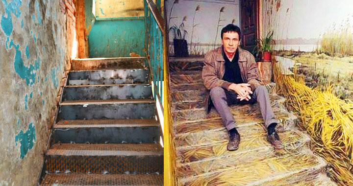 Астраханцу надоело каждый день добираться до своей квартиры, любуясь на старые стены с облупившейся краской. Теперь, поднимаясь на этаж, можно увидеть Киево-Печерскую лавру, затем появляется пристань на берегу Волги, а рядом с квартирой художника выросли камыши. Даже лестница в зависимости от пейзажа превращается то в тротуар, то в тропинку.