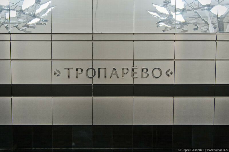 На станцию «Тропарево» Сокольнической линии московского метро первый пассажирский поезд прибыл 8 декабря 2014 года. Я сам на метро в этих краях бывал только в детстве, поэтому, когда отправился фотографировать открывшуюся станцию «Румянцево», решил посмотреть еще и «Тропарево». Односводчатая станция с аллеей из хай-тек деревьев посередине платформы сразу привлекла мое внимание. Очень необычно смотрится, когда проезжаешь на поезде, и мимо тебя мелькают встроенные в пол декоративные конструкции с отблескивающей металлической поверхностью, направленные к потолку. В последствие, после монтажа первой вставки в мае 2014 года, из-за невозможности осуществления данного проекта, было решено отказаться от его реализации. Тогда были представлены люстры освещения, окружающие кроны деревьев. Вестибюль станции. Вид на станцию со стороны турникетов. Очень интересная идея со смотровым мостом, хотя и не новая. Отражение. Возможно, с первоначальным вариантом освещения это отражение смотрелось бы интерес
