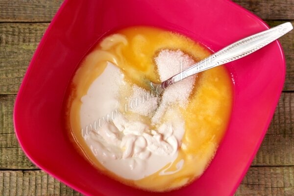 1. Соединить растопленное сливочное масло и сахар. Добавить сметану. Перемешать.
