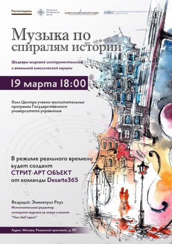 19 марта состоится уже четвертый концерт «Музыка по спиралям истории» в Государственном университете управления. Это просветительское и культурное мероприятие проходит в рамках проекта «Акцент на классической музыке», который получил поддержку Федерального агентства по делам молодежи. Целью проекта, созданного Александром Добромиловым, выпускником Московская государственная консерватория имени П.И. Чайковского, является привлечение внимания молодежи к классической музыке.