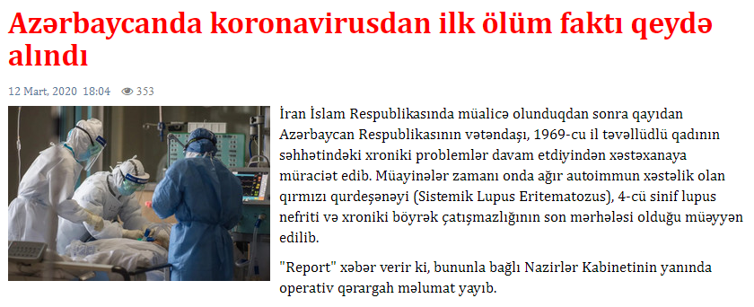 Гражданка Азербайджана 1969 года рождения, вернувшаяся в страну после лечения в Иране, обратилась в больницу из-за проблем со здоровьем. В ходе обследования у нее было обнаружено тяжелое аутоиммунное заболевание - красная волчанка, лупусная нефропатия 4-й степени и тяжелая хроническая почечная недостаточность в последней стадии, передает в четверг азербайджанское агентство Trend со ссылкой на Оперативный штаб при Кабинете министров. В то же время, было установлено, что она инфицирована коронавирусом. Состояние здоровья пациентки, которая помещена в больницу с особым режимом, оценивалось как средней тяжести, были приняты надлежащие меры для ее лечения. Несмотря на все усилия, ввиду последующих осложнений из-за тяжелого аутоимунного заболевания спасти ее жизнь не удалось.