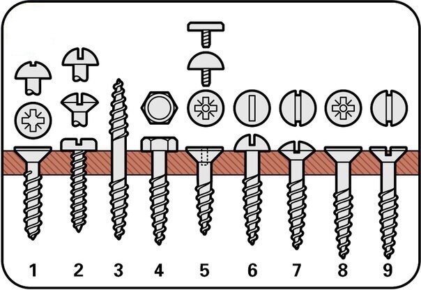 -- Головка: утапливаемая полукруглая -- Тип головки: PZ/PH/Torx -- Используется для: общих работ по дереву 2. Шуруп для листового металла -- Головка: цилиндрическая – овальная - круглая -- Тип головки: шлиц -- Используется для: крепления тонких листов металла или пластика. Эти шурупы являются самонарезными. 3. Резьбовой нагель (шуруп с нарезкой на двух концах) -- Головка: резьба под дерево (метрическая) -- Тип головки: шуруп с нарезкой на двух концах -- Используется для: потайных соединений деревянных панелей, балок и т. п. 4. Шуруп для дерева или шуруп с шестигранной головкой -- Головка: шестигранная -- Тип головки: под гаечный или торцевой ключ -- Используется для: крепления тяжелых балок и иных строительных элементов из дерева 5. Шуруп для навешивания зеркал -- Головка: утапливаемая -- Тип головки: PZ -- Используется для: подвески зеркал и аксессуаров ванной комнаты. Головка винта закрывается хромированной или пластиковой накладкой. 6. Шуруп для дерева -- Головка: круглая -- Тип гол