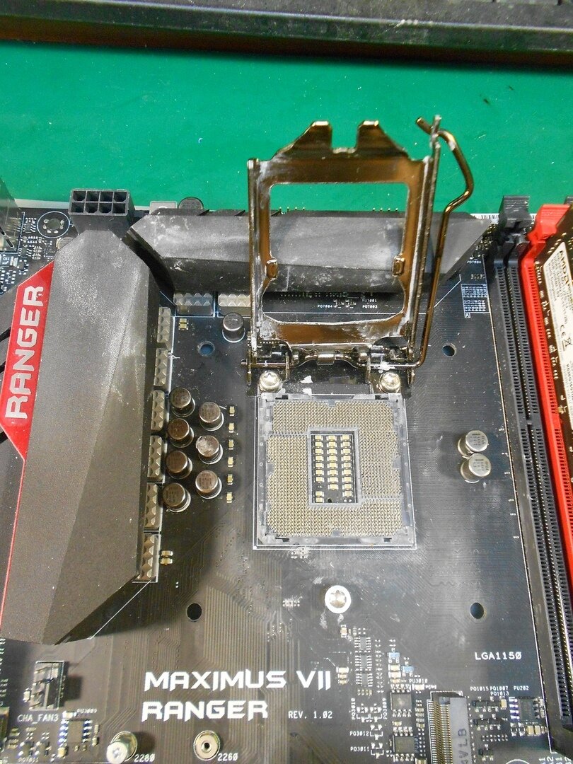 Asus Maximus VII Ranger попала ко мне на стол в жутком состоянии. Сокет был полностью залит термопастой. Похоже её нанесли ПОД процессор.