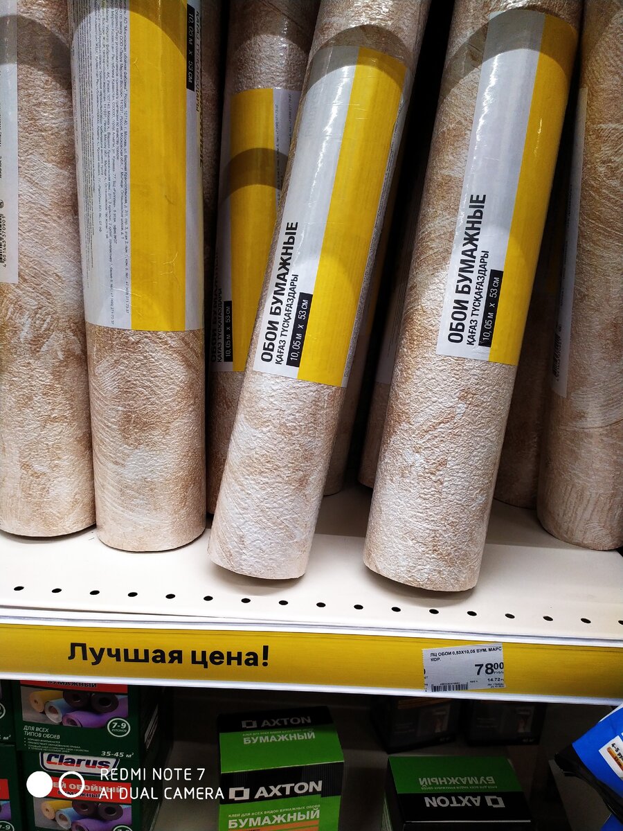 На своей даче я уже не делал ремонт более 15 лет.Холода прошли и можно заняться косметическим ремонтом.Хотя бы переклеить обои и навести марафет.Почти везде отклеились обои и краска совсем не свежая.А так, как рядом построили новый "Леруа Мерлен", я естественно поехал в этот магазин за покупками.Посмотрим,какие есть предложения? Начал я свой осмотр с бумажных обоев.Цены конечно совсем низкие,как видите 78 рублей за рулон 53 см на 10 метров в длину. Обои цвета "Синий мрамор".Цена 72 рубля. Обои "дуплекс" с цветным декором 0,53 на 10 метров.Цена 98 рублей. Бумажные тесненные обои,стандартный размер.Цена 146 рублей. А вот такие обои кирпичики стоят немного дороже.Цена 107 рублей. Тесненные бумажные обои тоже смотрятся не плохо.Размеры 53 см на 10 метров.Цена 158 рублей. Широкие обои 1 шириной и 10 метров длиною обои на флизелиновой основе по цене 336 рублей. На соседней полке тоже конкуренты с мелкими листьями.Цена 350 рублей за рулон. Клей обойный виниловый, для всех видов обоев.Упаковка