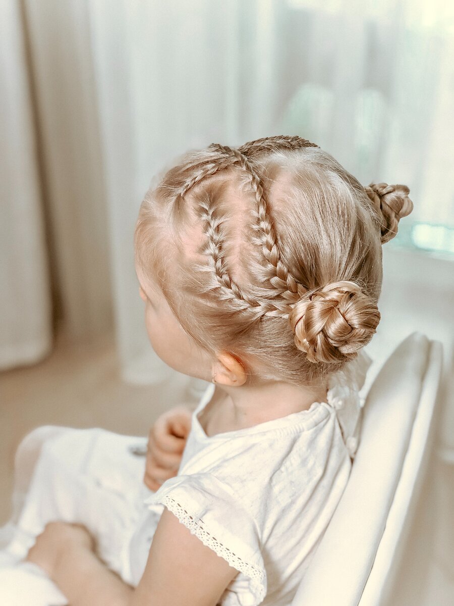 Переходим к верхней части. Берём прядь у лба чуть левее от середины и начинаем заплетать. Прядь разделили на три, правая прядь наверх в середину, левую наверх в середину, правую с подхватом небольшой пряди, максимально близкой к косе, наверх в середину, левую без подхвата проплетаем, правую с подхватом небольшой пряди, максимально близкой к косе, наверх в середину, левую плетём без подхвата. Коса идёт наискось, слева направо. С подхватом плетём примерно до уха, дальше доплетаем простую косу, фиксируем резинкой.