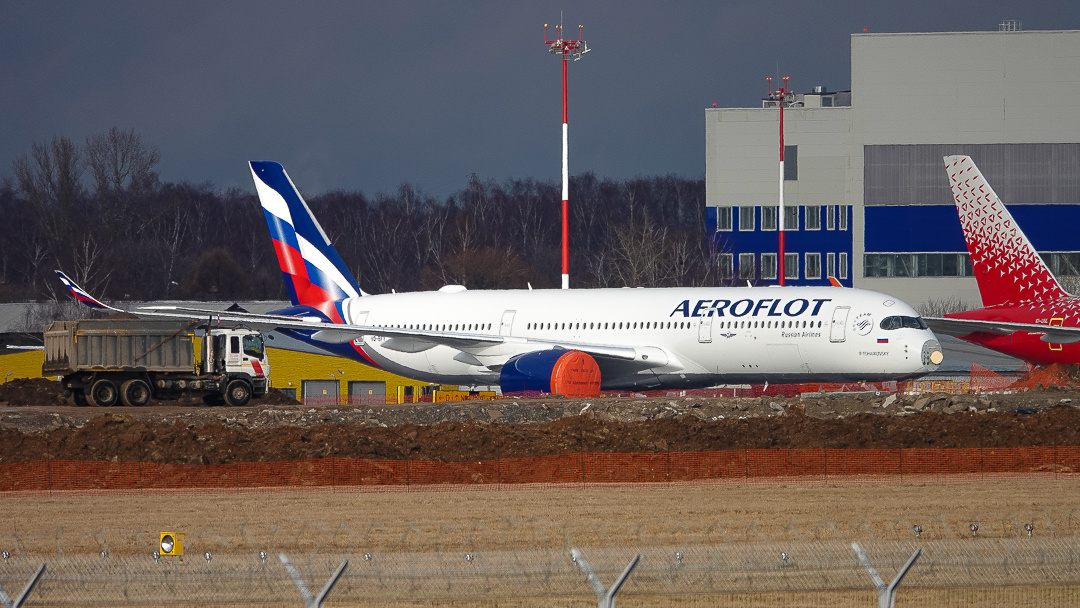Точнее без носового обтекателя, который закрывает антенну метеорадара. В сети ходит информация, что при перегонке самолета с завода-изготовителя в Московский аэропорт Шереметьево, в этот самый обтекатель попала птица. А самолет после первого своего рабочего дня встал на это место стоянки и уже несколько дней так и простаивает якобы из-за какого-то дефекта. Техника, даже хоть и новая но все таки может выходить из строя, и явно рушит компании все планы по вводу экипажей на этот самолет и открытия новых направлений. А вечером того же дня, обтекатель уже поставили на место.