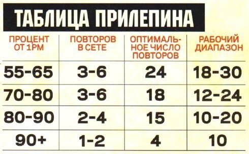 ОПТИМАЛЬНЫЙ ОБЪЕМ ТРЕНИРОВКИ Многие начинающие спортсмены увлекающиеся силовыми видами спорта не всегда знают как правильно рассчитать нагрузку. Понятно так как современный бодибилдинг и пауэрлифтинг превратился в химическое шоу где восстановление поддерживается лошадиными дозами стероидов. Но есть относительно чистые виды спорта, как тяжёлая атлетика. Там всё в натураху, так как на соревнованиях ,. что бы не говорили проводится жесточайший допинг контроль. Поэтому исходя из того что тяжёлая атлетика относительно чистый вид спорта можно применять объём тренировок в тяжелой атлетике. Александр Прилепин выдающийся тренер по тяжелой атлетике забрал тренировочные дневники победителей олимпиад и вывел из них оптимальный тренировочный объём нагрузки. Он сконцентрировал результаты своего исследования в таблице которая получила его фамилию. Применение этой таблицы требует некоторых изменений. Во первых данная таблица рассчитана на атлетов которые были очень одарённые поэтому на