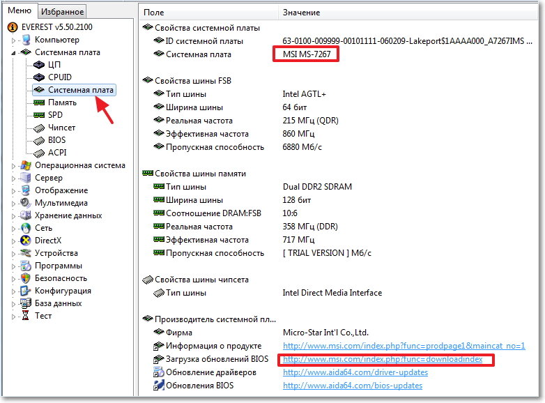 При помощи Everest узнаем точную модель вашей материнской платы и ссылку на загрузку свежей версии БИОС