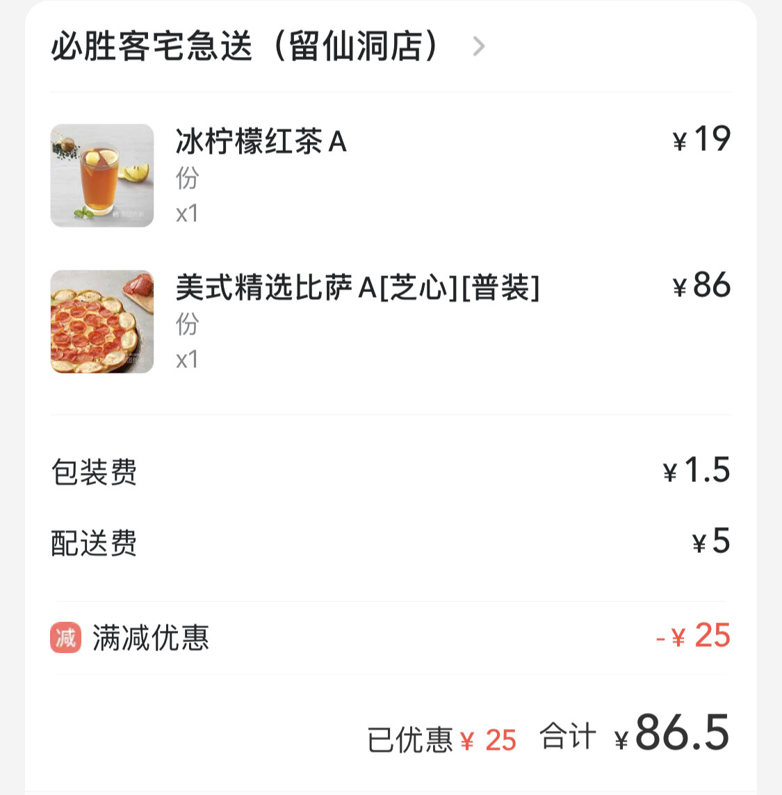 Итально-американская "Пепперони" + чай с лимоном. Со скидкой вышло ¥86.5 , что по нынешнему курсу - 924 рубля.