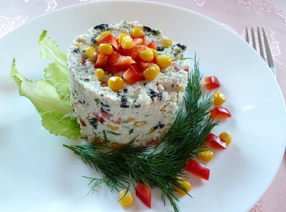 А этот вариант для тех , кто очень любит вкус класического крабового салата, но заботится о своем здоровье и стройности фигуры. Красный сладкий перец сыграет роль крабового мяса (визуально), кукуруза заменит яйцо, цветная капуста возьмет на себя роль риса, рыбный вкус мы получим от листиков Нори, а майонез у нас будет сыроедческий, из пророщеных семечек! Все вместе получается очень ярко, вкусно и, разумеется, очень полезно! Состав: Салат: Цветная капуста - 300 гр. Болгарский перец - 100 гр. Кукуруза свежая (или размороженная) - 100 гр. Листы Нори - 1-2 штуки Укроп - 20 гр. Майонез: Семечки подсолнуха пророщенные - 100 гр. Горчица обычная - 1 ч.л. Сок лимона - 1 ст.л. Мед - 1 ч.л. Соль - по вкусу Вода - 70 гр. Калорийность: 100 гр. = 130 кк. Приготовление: Подготавливаем все необходимые продукты.
