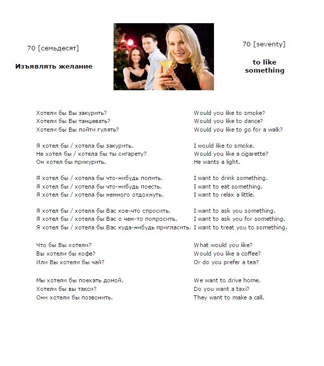 Английский язык. Урок 1. Английский язык. Урок 69. Добрый день! Продолжим изучение английского языка. Английский язык. Урок 70. 70 (семьдесят) - 70 (seventy) Изъявлять желание - to like something Хотели бы Вы закурить? - Would you like to smoke? Хотели бы Вы танцевать? - Would you like to dance? Хотели бы Вы пойти гулять? - Would you like to go for a walk? Я хотел бы / хотела бы закурить. - I would like to smoke. Не хотел бы / хотела бы ты сигарету? - Would you like a cigarette? Он хотел бы прикурить. - He wants a light. Я хотел бы / хотела бы что-нибудь попить. - I want to drink something. Я хотел бы / хотела бы что-нибудь поесть. - I want to eat something. Я хотел бы / хотела бы немного отдохнуть. - I want to relax a little. Я хотел бы / хотела бы Вас кое-что спросить. - I want to ask you something. Я хотел бы / хотела бы Вас о чем-то попросить. - I want to ask you for something. Я хотел бы / хотела бы Вас куда-нибудь пригласить. - I want to treat you to something. Что бы Вы хотели?