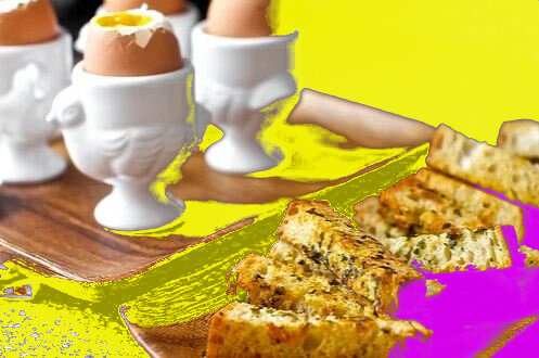 4 больших яйца Приступим Приготовим сухарики: разогреть духовку до 200°C. Поместите ломтики хлеба в мелкую, широкую миску. Взбейте вместе масло и горчицу, затем перелейте в миску с хлебными ломтиками. Добавьте соль, перец, сыр обоих сортов, петрушку (тимьян). Перемешайте. Расстелите на противень фольгу. Разложите хлеб по листу. Выпекать сухарики до золотистого цвета, переворачивая около 20 минут. Отложить в сторону. Тем временем приготовим яйца: Налейте воду в