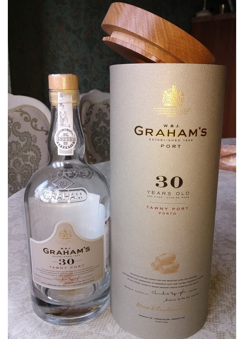 Graham's некоторое время назад меня обидел: винтажный портвейн 2003 года был испорчен пробкой. Такое вот невезение. Но я дал ему шанс реабилитироваться. Итак, Grahams 30 Year Old Tawny Port, Португалия. Как мы знаем, указание срока у портвейнов условное. Процитирую википедию: «Ошибочно мнение, что это число является минимальным средним возрастом компонент; на самом деле, она определяется экспертами, исходя из характеристик получившегося вина». То есть, это вино эксперты посчитали по характеристикам 30-летним. У него очень солидная подарочная упаковка. Такую крутую упаковку для вин я видел первый раз. Картонный цилиндр изнутри как бы с искусственным мехом, очень мягким. Сверху тяжёлая полностью деревянная «шайба» – крышка. Закрывается поворотом. Пил я его несколько дней. Только в один из моментов он показался мне несколько спиртуозным (всё же 20% крепость), и больше такого не было, и вообще недостатков не было. К описанию достоинств приступаю. Аромат и вкус многоплановые. Сухофрукты и