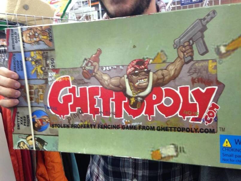 Азарт, авантюризм, эффект неожиданной находки — все это неотъемлемые части шопинга в секонд-хендах. В секонд-хенды лучше ходить регулярно, в рамках прогулки и развлечения, а не планового шопинга. Вдруг что приглянется? А нет, так хоть посмеетесь над всякими смешными вещами. Сюда стоит идти не за конкретным предметом одежды, а за сюрпризом. В поисках вещей покупатель проходит через долгий монотонный процесс просмотра множества неподходящей одежды. Более того, если в сетевых магазинах в ассортименте представлена широкая размерная линейка, в случае с секонд-хендами понравившаяся вещь не всегда подходит. Это всегда лотерея. Один раз я могу потратить весь запас денег и вынести два мешка клевых вещей, а в другой день уйти с пустыми руками. Хотелось бы показать какие забавные вещи можно найти в секонд-хенде. 1. Настольная игра про негритянское гетто