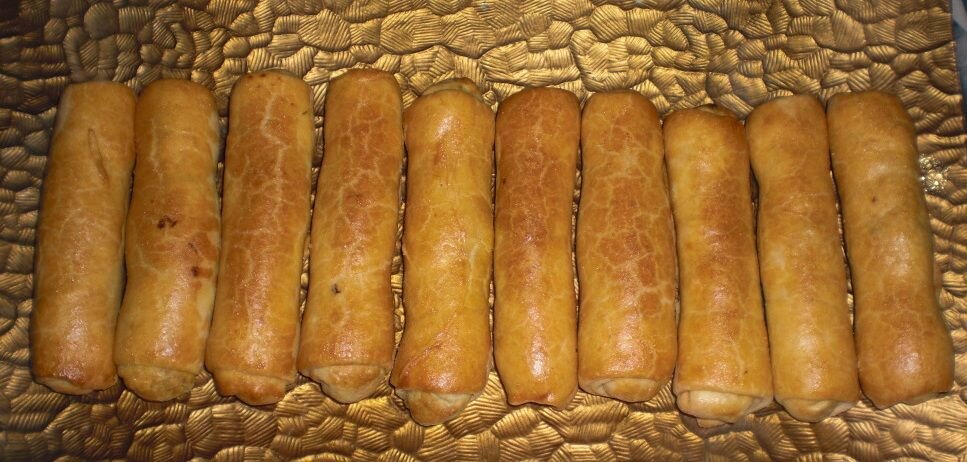 Ингредиенты: Мука пшеничная / Мука - 2 стакана МАсло растительное - 0.5 стакана Вода - 0.5 стакана Соль Капуста белокочанная / Капуста (свежая или квашеная) - 1 вилок Морковь - 1 шт Лук репчатый - 1 шт Из муки, масла, воды и соли замешиваем мягкое и эластичное тесто, разделяем на 12-14 кусочков Каждый кусочек раскатываем практически до прозрачного состояния и кладём на край начинку -у меня это потушенная на сковороде шинкованная капуста с луком и морковью, для кислинки добавил сок лимона, можно уксус. Аккуратно заворачиваем, формируя нашу"сигару", выкладываем на противень швом вниз, пирожок получается размером где-то 10*3 см. Смазываем яйцом и выпекаем при 200 градусах минут 20-30, до золотистого цвета Приятного аппетита)