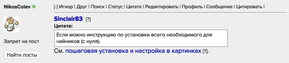 Форум встретил портянкой мануала в шапке и обсуждениями в топике. Разобравшись с рекомендациями, свёл всё необходимое к трём гифкам - от установки до расстановки галочек. Выложил в сеть, предложил покритиковать. С этого момента... что-то пошло не так. Где бомбануло, точно не знаю, поэтому описываю в деталях.